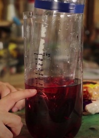 - Segure o embolo junto ao fundo da garra. Coloque água dentro da garrafa PET de 3 litros até chegar a, aproximadamente, 8cm de distância da fita do embolo.